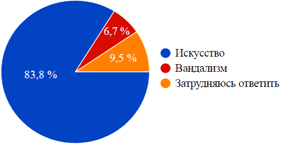 Результаты анкетирования респондентов представлены в виде диаграмм. Большинство опрошенных горожан считают, что стрит-арт — это искусство (рис. 5).