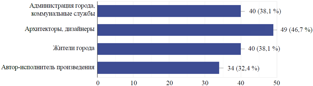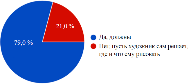 По имеющимся данным мы не можем точно определить причину, с которой связано преобладающее мнение, и потому считаем необходимым продолжить исследование с целью их уточнения. Отчасти именно с данным фактором коррелируется запрос большинства респондентов на правовое фиксирование допустимых этических границ и формирование ряда более строгих ограничений для авторов, создающих объект стрит-арта в общественном месте. С этим связано и мнение большинства о необходимости создания контролирующих комитетов с привлечением администрации города, деятелей искусств, дизайнеров и архитекторов с надеждой на их компетентность в вопросе утверждения темы и эскизного проекта арт-объекта, его местоположения с привлечением представителей городской общественности.