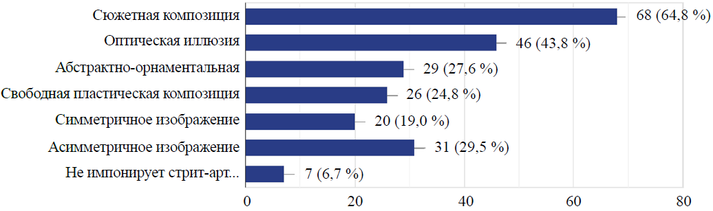 Среди опрошенных горожан, которым импонирует стрит-арт, наиболее привлекательными оказались сюжетная композиция или наличие художественного приема оптической иллюзии (рис. 9).
