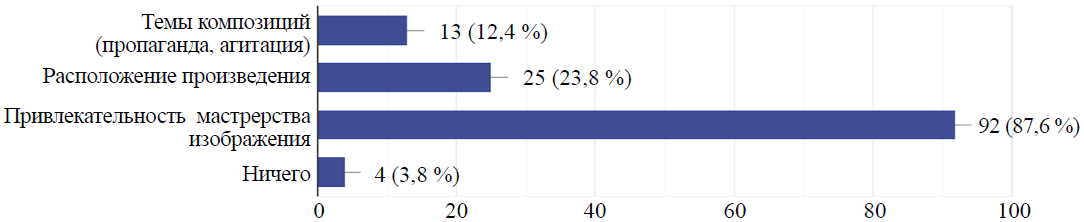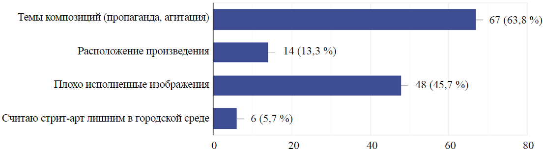 Благодаря данному опросу был выявлен социально-культурный запрос горожан и намечена траектория последующих исследований. По результатам анкетирования, в произведениях стрит-арта большую часть респондентов привлекает мастерство исполнения изображений и это показатель сформированного понимания о художественности произведений и представления эстетики красоты настенной живописи. При этом наиболее неуместными для стационарного декорирования горожане считают темы агитации и пропаганды в изображениях.