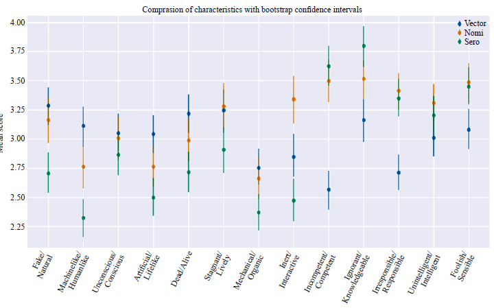 Results. The analysis confirmed the stability of the main differences identified in the preliminary hypotheses description: using a two-pronged approach (parametric confidence intervals and bootstrapping), stable mean values were observed for key indicators (Fig. 1). Intergroup analysis revealed statistically significant differences in the level of perceived anthropomorphism between the bots (ANOVA, p < 0,001). The non-parametric Kruskal-Wallis test confirmed this difference for the anthropomorphism index (H = 23,609, p < 0,001), animacy (H = 19.265, p < 0,001), and perceived intelligence (H = 38,899, p < 0,001) (Fig. 2–5). Post-hoc Tukey and Dunn tests clarified that the main variance in anthropomorphism is explained by the “Vector” vs. other bots contrast: Vector demonstrates noticeably higher mean anthropomorphism scores (M = 3,123) compared to Sero (M = 2,598) and Nomi (M = 2,924) (Fig. 6). This confirmed the study’s Hypothesis 1.