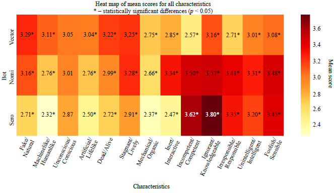 Fig. 2. Mean score values for each characteristic per bot, with labeling of statistically significant characteristics in ANOVA