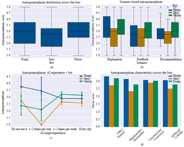 Fig. 3. Comparative analysis of anthropomorphism score distributions: a) − by bot types; b) − by interaction scenarios; c) based on AI usage experience; d) − component structure of anthropomorphism for all bots. Results are confirmed by the non-parametric Kruskal-Wallis test (H = 23.609, p < 0.001) with post-hoc Dunn testing