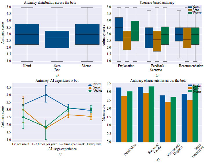 Fig. 4. Comparative analysis of animacy score distributions: a) − by bot types; b) − by interaction scenarios; c) − based on AI usage experience; d) − component structure of anthropomorphism for all bots. Results are confirmed by the non-parametric Kruskal-Wallis test (H = 19.265, p < 0.001) with post-hoc Dunn testing
