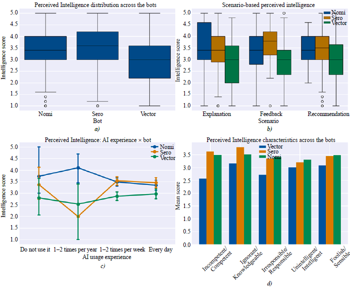 Fig. 5. Comparative analysis of perceived intelligence score distributions: a) − by bot types; b) − by interaction scenarios; c) − based on AI usage experience; d) − component structure of anthropomorphism for all bots. Results are confirmed by the non-parametric Kruskal-Wallis test (H = 38.899, p < 0.001) with post-hoc Dunn testing